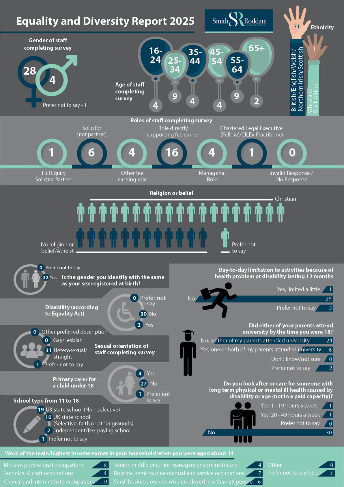 As an SRA-regulated firm, Smith Roddam Solicitors collects, reports, and publishes data about the makeup of our workforce every two years. Below is our 2025 report.